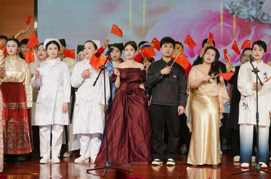 晚会现场红旗飘扬,温馨而热烈。台上演员倾情演绎,台下观众掌声雷动,闪光灯与欢呼声交织成一片欢乐的海洋。